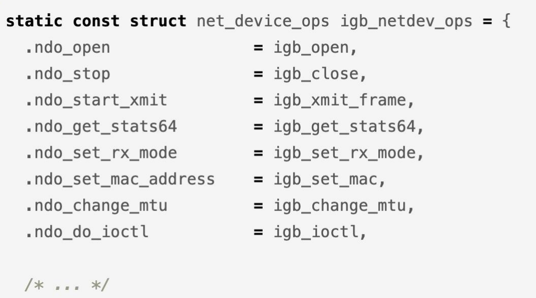 上图截取的部分,是在初始化时结构体的赋值。前面两个可以简单看一下,驱动在初始化的时候会告诉内核,如果想要操作这块网卡对应的回调函数,其中最主要的是启动和关闭,有用 ifconfig 工具操作网卡的应该都很熟悉,当用 ifconfig up/down 一张网卡的时候,调用的都是它初始化时指定的这几个函数。