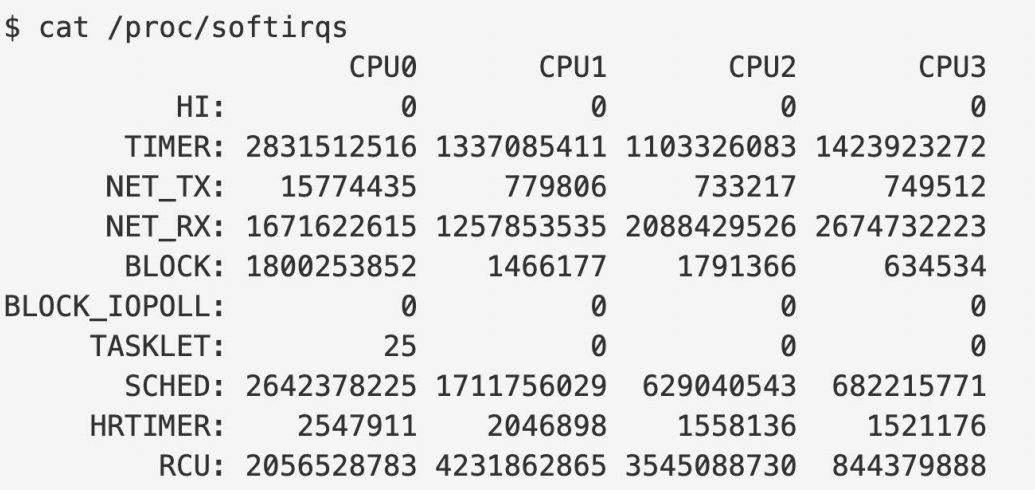 软中断机制的信息在 softirqs 下面可以看到。软中断并不多只有几种,其中需要关注的,跟网络相关的就是 NET-TX 和 NET-RX,网络数据收发的两种场景。