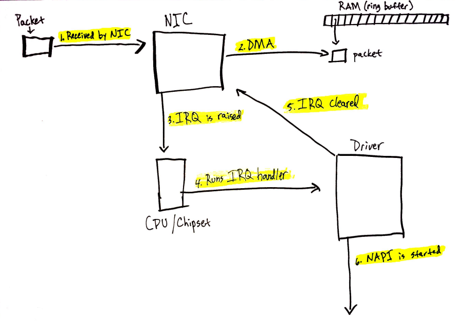 第三步产生了一个中断告诉 CPU 并开始处理中断。重点的中断处理可分为两步:一是将中断信号屏蔽了,二是唤醒 NAPI 机制。