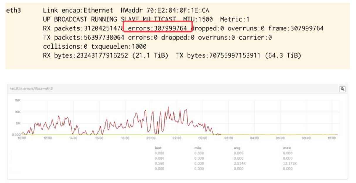 当然这只是瞬时的状态,上图中下面部分是监控数据,可以明显看到波动的变化,确实是某一台机器异常了。frame 错误一般是在网卡收到数据包,进行 RCR 校验时失败导致的。当收到数据包,会对该包中的内容做校验,当发现跟已经存下来的校验不匹配,说明包是损坏的,因此会直接将其丢掉。