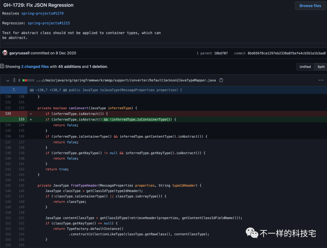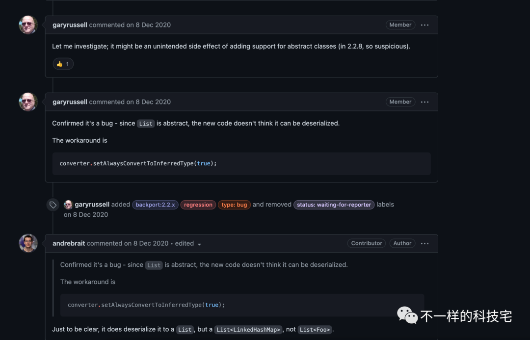 然后garyrussell这个人说:他们添加了对抽象类反序列化的支持,如果配置不正确,这会对消息转换器产生一些副作用。然后调查了一下,确认这是一个错误。是由于List是抽象的,新代码认为它不能反序列化。