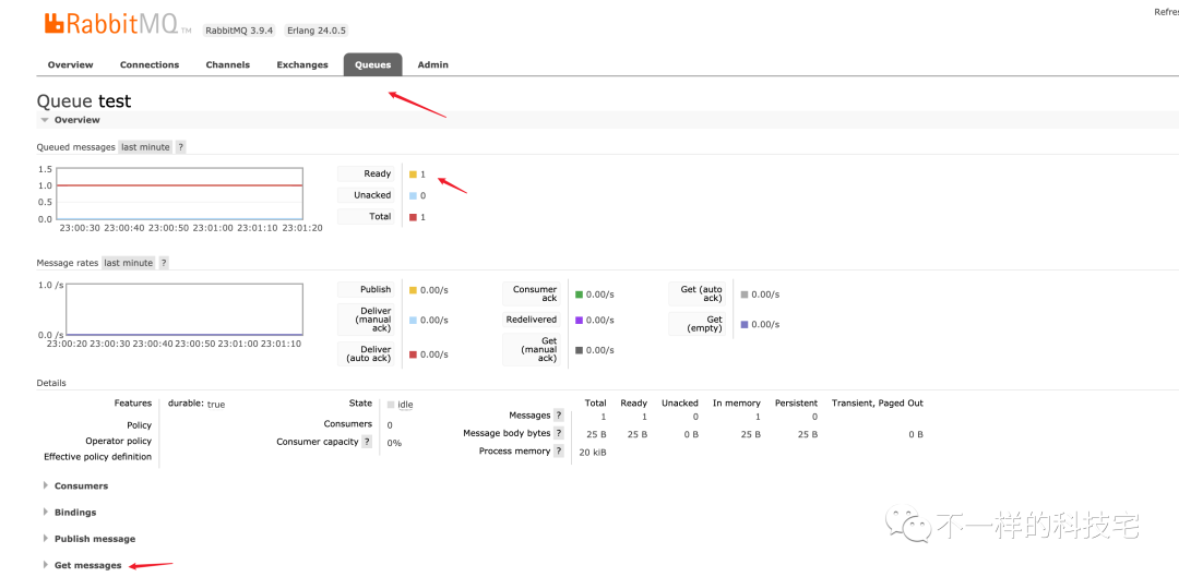 首先错误信息是在消费端抛出来的,按理应该是消费端出问题概率较大。但是如果和他说的一样,我生产端发送的消息就是错误的,从而导致消费端出问题呢?这对这个疑问,我先断开消费端,然后发送一条消息,并通过Rabbitmq的管控台来查看消息的内容是否正确。