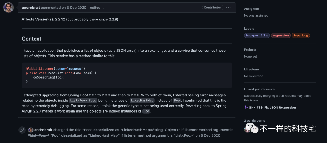 大致是说:尝试从 Spring Boot 2.3.1 升级到 2.3.3,然后再升级到 2.3.6。错误信息依然是:List<Foo> foos是LikedHashMap,而不是Foo对象。并通过远程调试确认了这种情况。出于某种原因,他认为没有正确使用泛型类型。恢复到 Spring-AMQP 2.2.7 使它再次工作,并且对象确实是Foo。