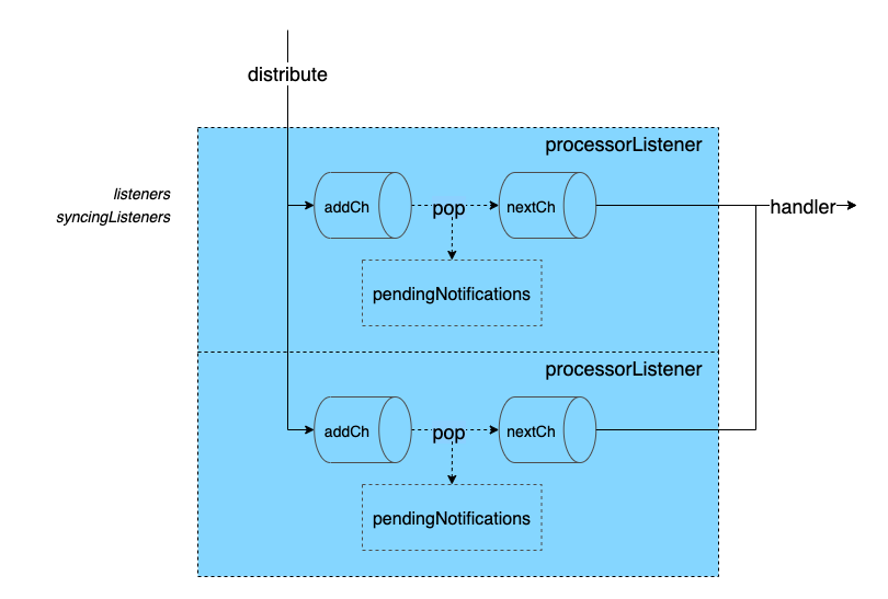 从代码可以看到 processorListener 巧妙地使用了两个 channel(addCh, nextCh) 和一个 pendingNotifications(由 slice 实现的滚动 Ring) 进行 buffer 缓冲,默认的 initialBufferSize = 1024。既做到了高效传递数据,又不阻塞上下游处理,值得学习。