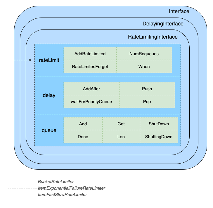 从图中可以看到,workqueue.RateLimitingInterface 集成了 DelayingInterface,DelayingInterface 集成了 Interface,最终由 rateLimitingType 进行实现,提供了 rateLimit 限速、delay 延时入队(由优先级队列通过小顶堆实现)、queue 队列处理 三大核心能力。