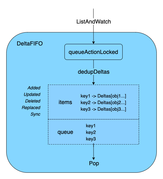 通过上面的 Reflector 分析可以知道,DeltaFIFO 的职责是通过队列加锁处理(queueActionLocked)、去重(dedupDeltas)、存储在由 DeltaFIFO 实现的本地缓存(local Store) 中,包括 queue(仅存 objKeys) 和 items(存 objKeys 和对应的 Deltas 增量变化),并通过 Pop 不断消费,通过 Process(item) 处理相关逻辑。