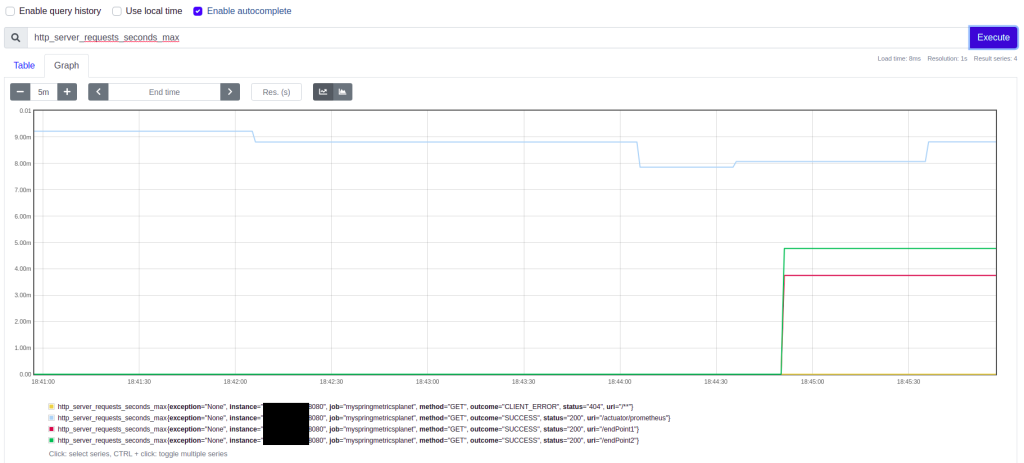 现在可以显示Prometheus指标。通过访问http://localhost:9090/graph,在搜索框中输入http_server_requests_seconds_max并单击“执行”按钮,将为你提供请求期间的最长执行时间。