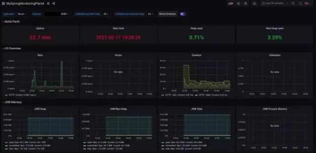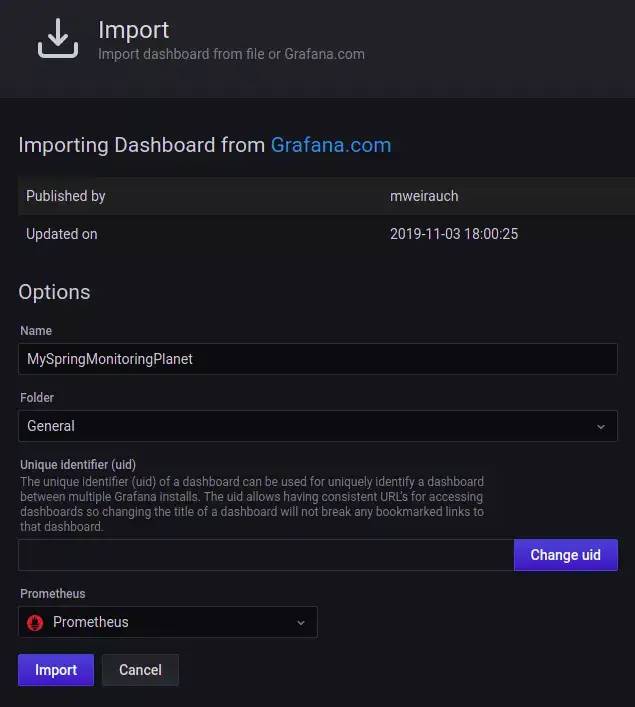 为仪表板输入一个有意义的名称(例如MySpringMonitoringPlanet),选择Prometheus作为数据源,然后单击Import按钮。