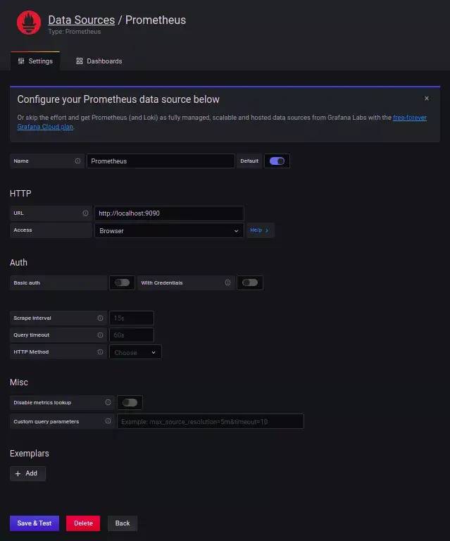 填写可访问Prometheus的URL,将HTTP Access设置为Browser,然后单击页面底部的Save&Test按钮。