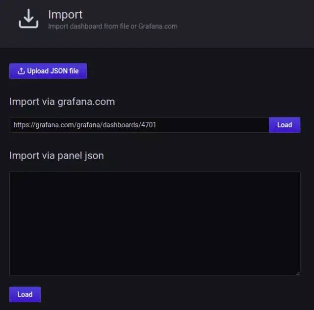 输入JVM仪表板的URL https://grafana.com/grafana/dashboards/4701,然后单击“Load(加载)”按钮。
