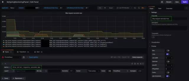 在Metrics 字段中,输入http_server_requests_seconds_max,在右侧栏中的Panel title字段中,可以输入面板的名称。