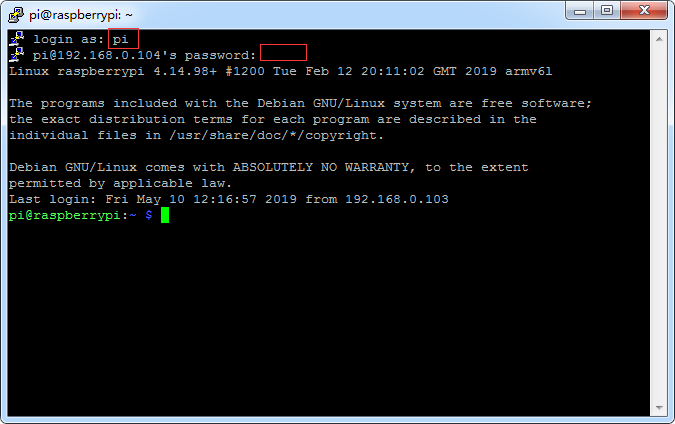 可以看到我们 zero w 的 ip 为 192.168.0.104,然后使用 ssh 连接工具(推荐使用 putty)连接树莓派,初始账户为 pi,密码是 raspberry。