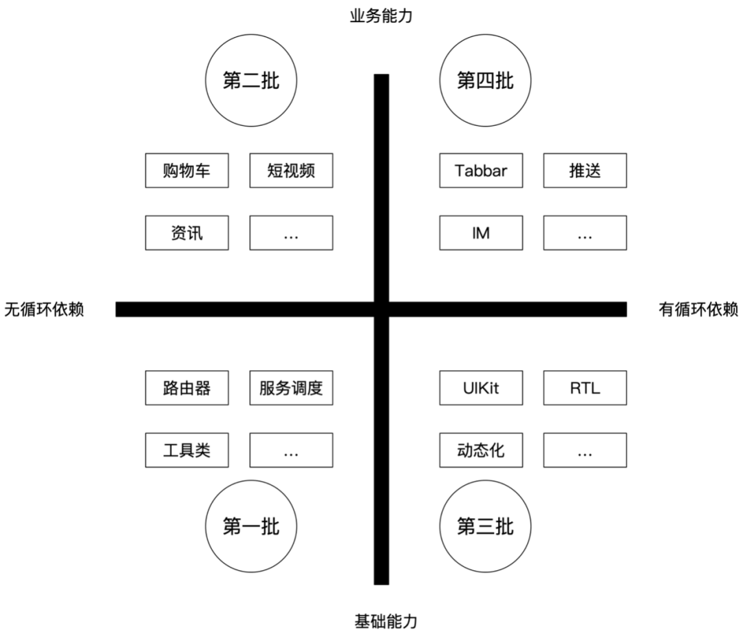最后使用四象限分析法,将模块分为4个组,1基础模块无循环依赖、2基础模块有循环依赖、3业务模块无循环依赖、4业务模块有循环依赖,按顺序治理每一组。