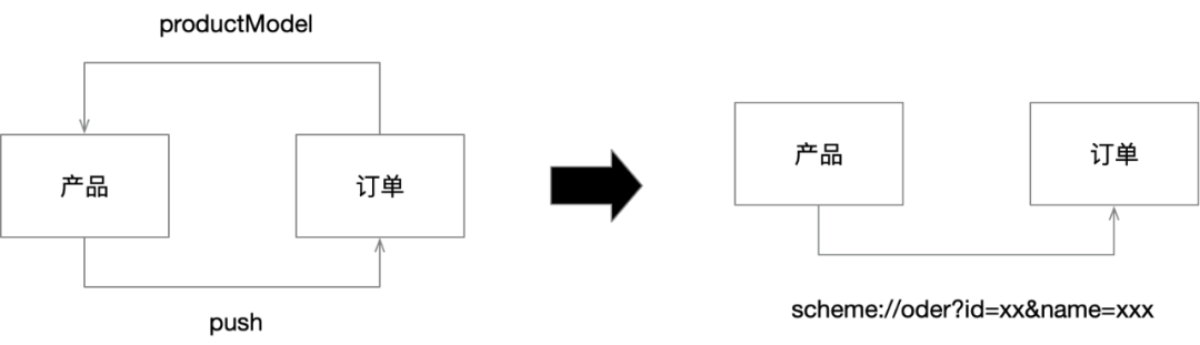 场景二, 产品模块跳转订单模块时使用产品的model作为API的入参,订单模块为了引用产品的model,反向依赖了产品模块。这种场景解耦的方式是使用路由URL Scheme协议,将model转化为URL中query的入参。