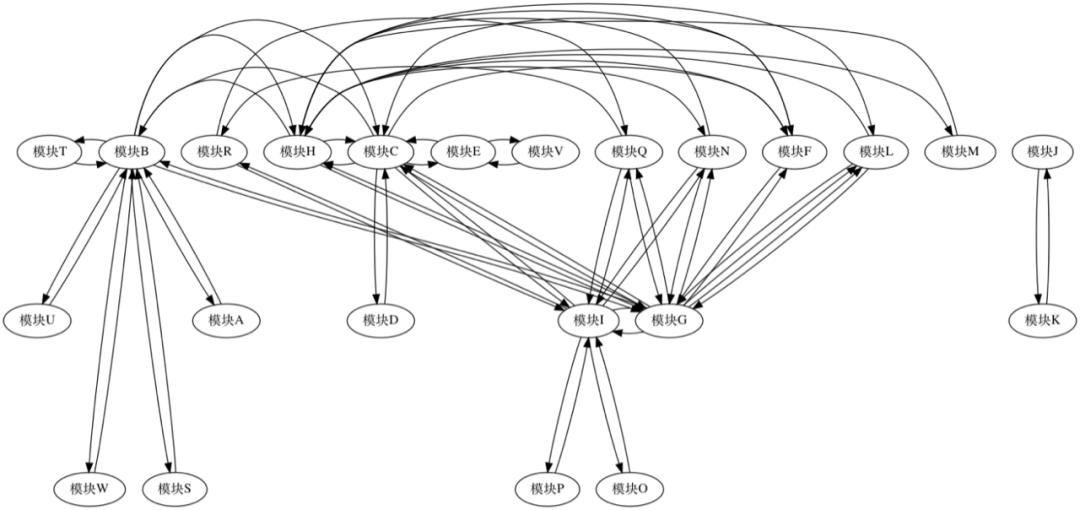 下一步是视觉化,视觉化以后可以更直观地查看模块关系的复杂度,方便制定治理计划。我使用了Dot language来描述模块关系,可以自动生成整个工程的依赖关系图,也可以生成某个特定模块的依赖关系图。