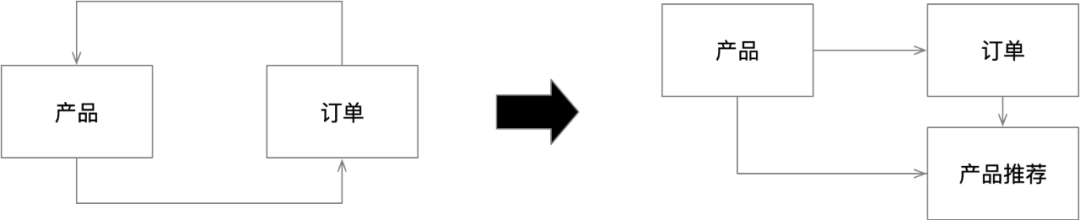 场景一, 产品模块里有一个子业务是产品推荐,订单模块也需要用到,于是订单模块会反向依赖产品模块,形成循环关系。这种场景解耦的方式是从产品模块中拆分出基础组件,订单模块依赖基础组件。