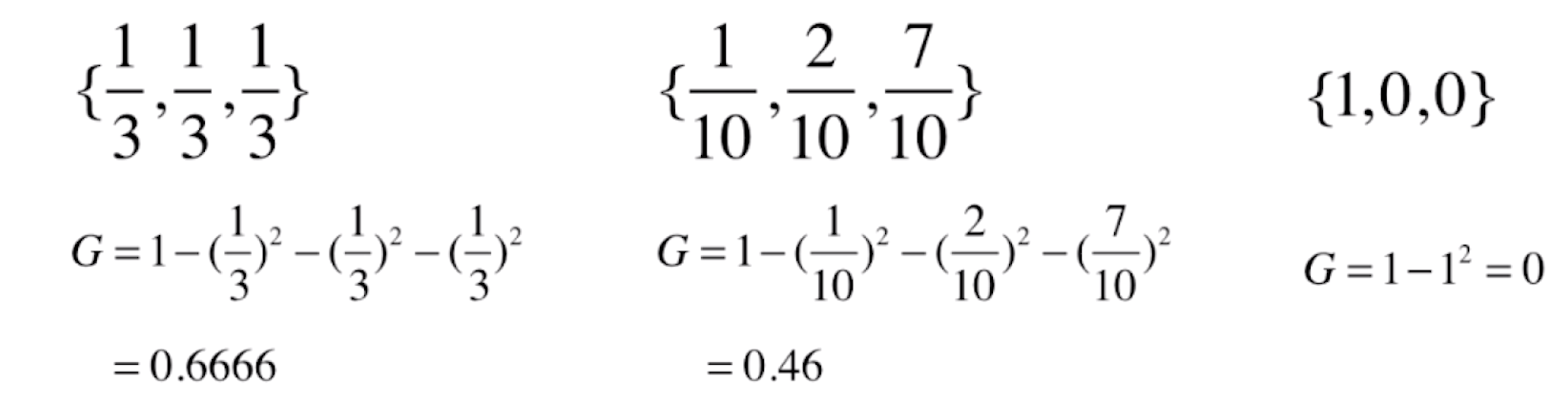 这个式子和信息熵对应的式子是有同样的性质的,跟信息熵一样,我们先使用几个例子来看一下基尼系数。