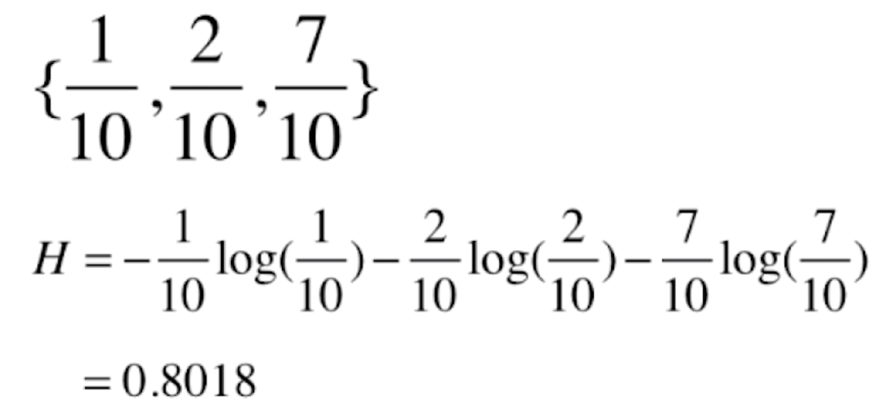 再比如有一种分类,其中一种分类占1/10,第二种占2/10,第三种占7/10,那么它的信息熵就为