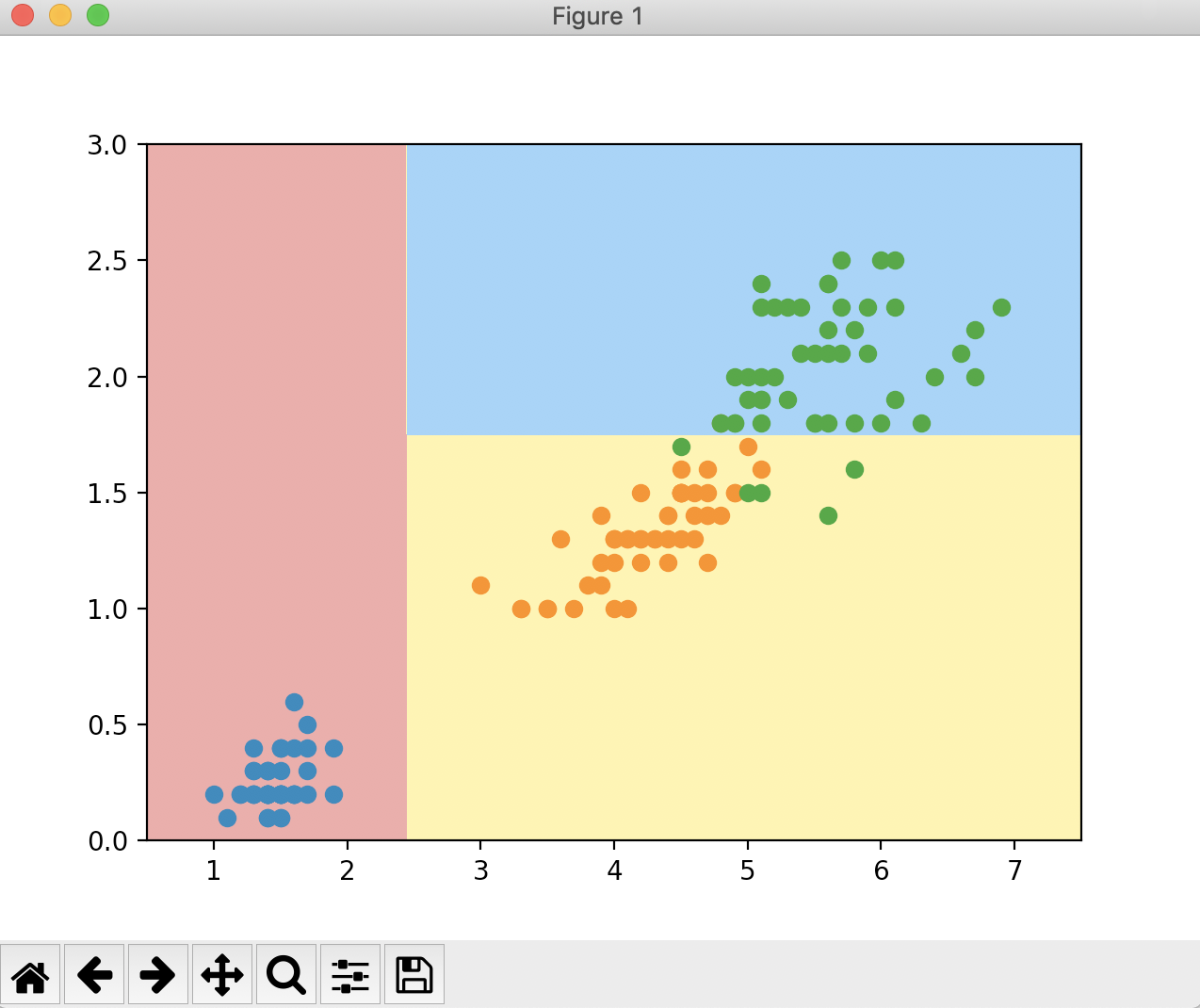 import numpy as np import matplotlib.pyplot as plt from sklearn import datasets from sklearn.tree import DecisionTreeClassifier from matplotlib.colors import ListedColormap if __name__ == "__main__": iris = datasets.load_iris() # 保留鸢尾花数据集的后两个特征 X = iris.data[:, 2:] y = iris.target dt_clf = DecisionTreeClassifier(max_depth=2, criterion='gini', splitter='best') dt_clf.fit(X, y) def plot_decision_boundary(model, axis): # 绘制不规则决策边界 x0, x1 = np.meshgrid( np.linspace(axis[0], axis[1], int((axis[1] - axis[0]) * 100)).reshape(-1, 1), np.linspace(axis[2], axis[3], int((axis[3] - axis[2]) * 100)).reshape(-1, 1) ) X_new = np.c_[x0.ravel(), x1.ravel()] y_predict = model.predict(X_new) zz = y_predict.reshape(x0.shape) custom_cmap = ListedColormap(['#EF9A9A', '#FFF59D', '#90CAF9']) plt.contourf(x0, x1, zz, linewidth=5, cmap=custom_cmap) plot_decision_boundary(dt_clf, axis=[0.5, 7.5, 0, 3]) plt.scatter(X[y == 0, 0], X[y == 0, 1]) plt.scatter(X[y == 1, 0], X[y == 1, 1]) plt.scatter(X[y == 2, 0], X[y == 2, 1]) plt.show()