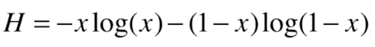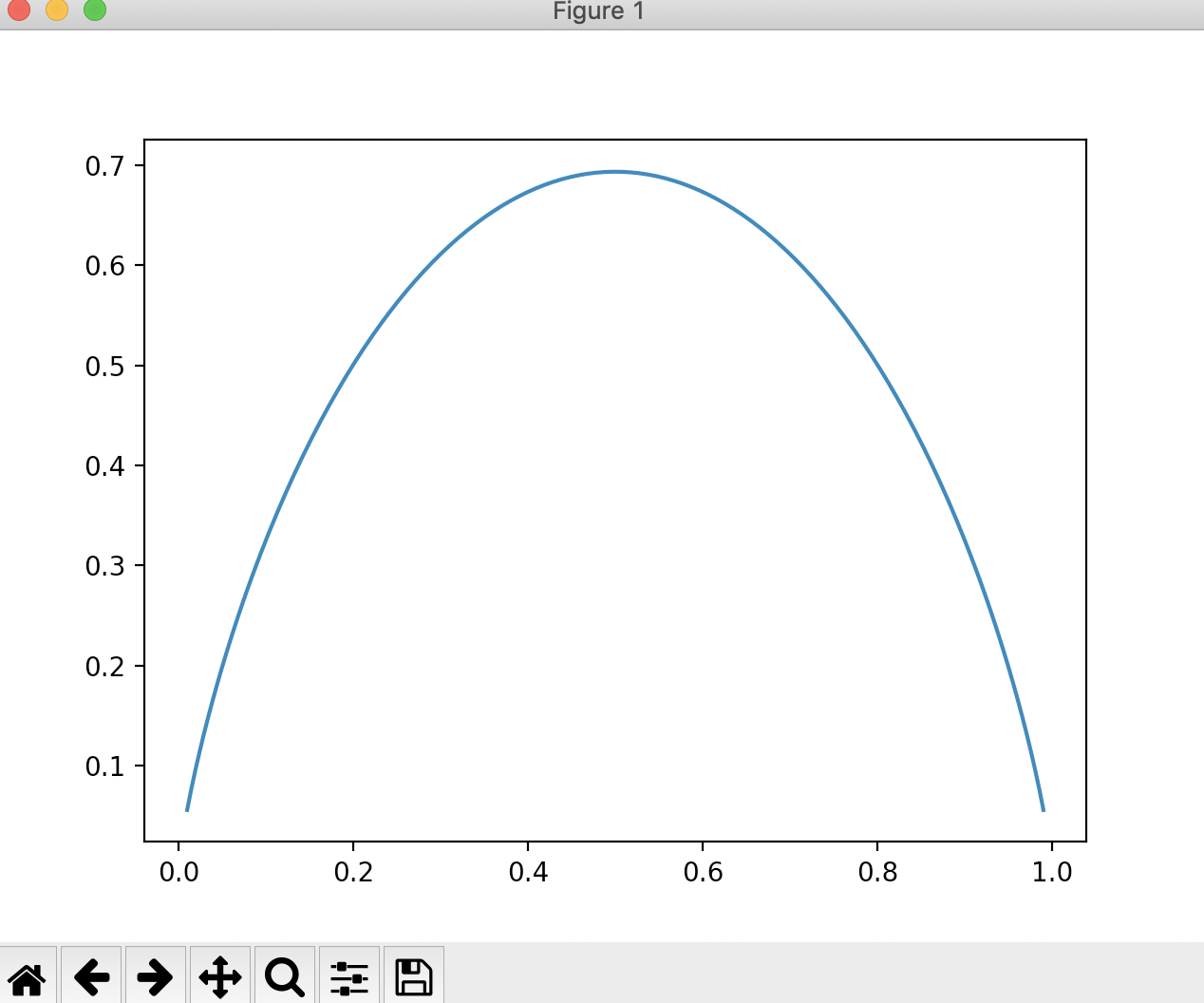 信息熵为0,说明它的不确定性是最低的,即最确定的。在代码上,我们以二分类为例来看一下这个公式的图像是什么样子的。对于二分类来说,该公式可以转化为