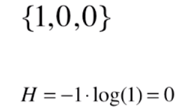这种分类的信息熵比鸢尾花分类的信息熵要小,意味着这种分类比鸢尾花的分类更确定。这是因为这种分类第三种分类占了70%,所以这种分类是更确定的。而鸢尾花数据每一个类别各占了1/3,所以这个数据整体它的不确定性就越高。我们再来看一组更极端的数据,依然是三类,其中一类占100%。