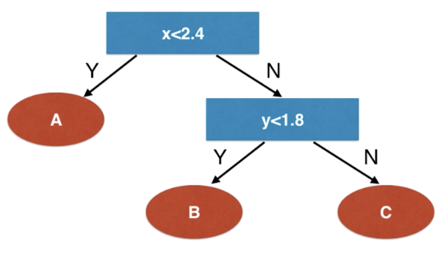 这就是决策树在面对属性是一种数值特征的时候是怎样处理的。在这里我们可以看到,在每一个节点上,它选择某一个维度,以及和这个维度相应的阈值,比如说在根节点的时候选的是x这个维度和2.4这个阈值。看我们的数据是大于等于2.4还是小于2.4分成两支。在右分支的子节点,选择了y这个维度和1.8这个阈值,看数据点到了这个节点的话是小于1.8还是大于等于1.8来进行分类。
