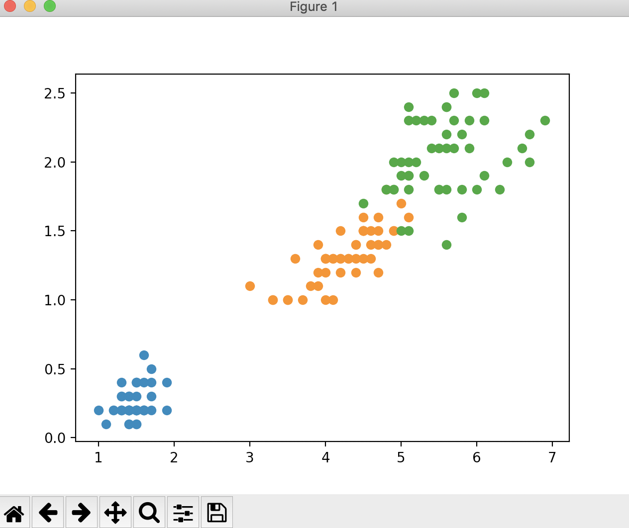 import numpy as np import matplotlib.pyplot as plt from sklearn import datasets if __name__ == "__main__": iris = datasets.load_iris() # 保留鸢尾花数据集的后两个特征 X = iris.data[:, 2:] y = iris.target plt.scatter(X[y == 0, 0], X[y == 0, 1]) plt.scatter(X[y == 1, 0], X[y == 1, 1]) plt.scatter(X[y == 2, 0], X[y == 2, 1]) plt.show()