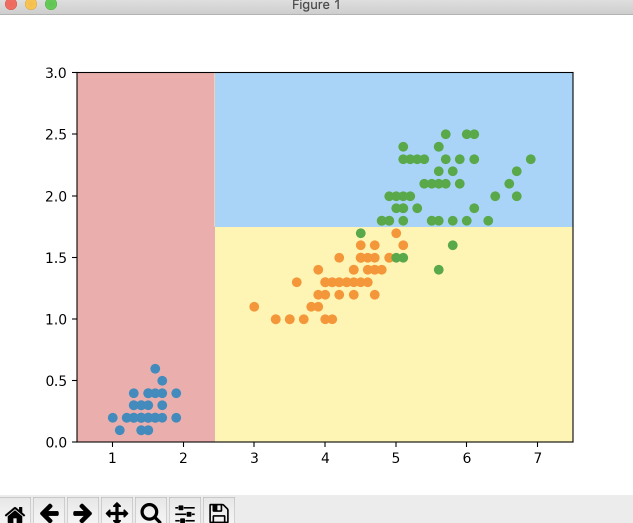 这里通过第一次划分,第一类的基尼系数为0,达到了一个最小值。除第一类的其他类的基尼系数为0.5。第一次划分的维度为0,划分的阈值为2.45。第二次划分的最小基尼系数为0.21,第二次划分的维度为1,划分的阈值为1.75。对于剩下的两个节点,它们的基尼系数依然没有到0,我们可以对这两个节点继续向下划分。
