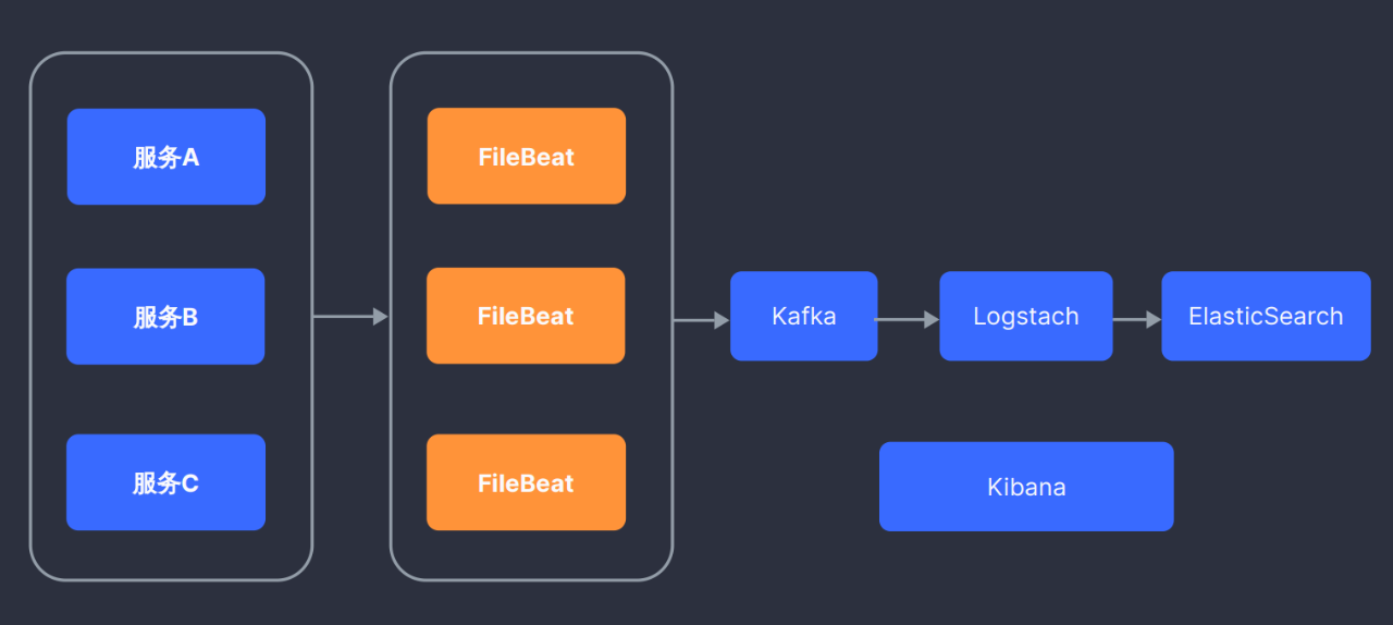 上图是一个比较通用的日志处理方案,每一个服务产生的日志都是通过 Filbeat 收集到 Kafka,然后到 Logstach,最后到 ElasticSearch。其中 Kibana 是一个可视化界面,方便我们分析日志。