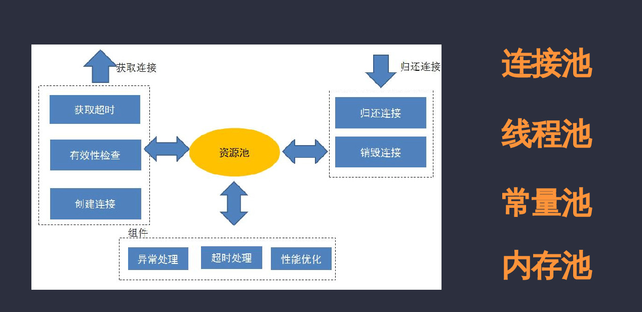 上图是池化技术的抽象概念,一般获取连接以及线程用完后都会放入资源池资源池。同时我们还需要有以下四个概念:连接池、线程池、常量池、内存池。