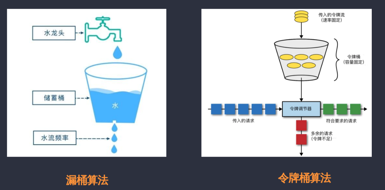 服务限流有两种主要算法,漏桶算法与令牌桶算法。我们可以看一下上图,它画的比较形象。漏桶算法中我们可以将流量想象成一杯水,在水流流出的地方进行限制,无论水流流入的速度有多快,但是流出速度是一样的。令牌桶则是建立一个发放令牌的任务,让每一个请求进入前都需要先拿到令牌,如果请求速度过快令牌不够用时就采取对应的限流策略。除去这两种算法,一般还会用到大家都很熟悉的计数器算法,感兴趣的朋友也可以去自行了解一下,这里我们就不细谈了。