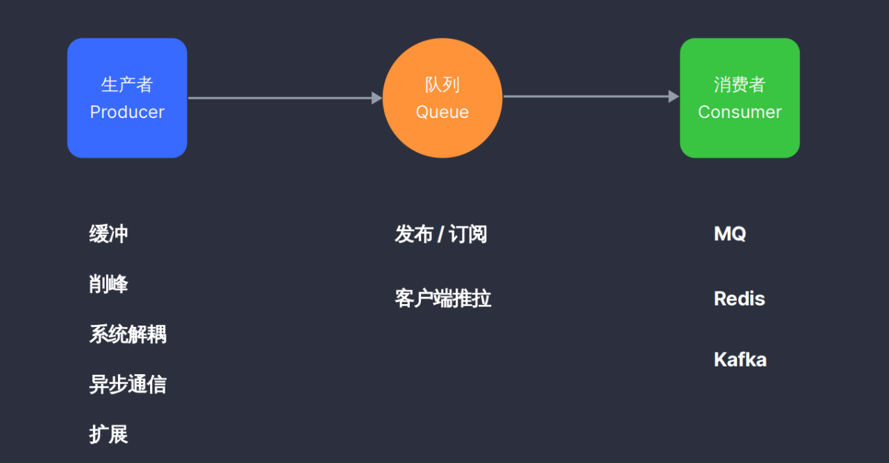 如图所示,消息队列的主要概念是生产者会将消息放入队列中,由消费者从队列中获取消息并解决。我们通常使用 MQ、Redis、Kafka 来做消息队列。队列负责解决发布/订阅和客户端推拉两个问题,生产者负责解决以下问题: