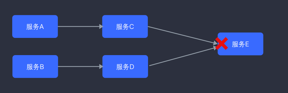 服务 A、B 分别调用服务 C、D,而这两者则都会调用服务 E,一旦服务 E 挂掉就会因为请求堆积而拖垮前面的全部服务。这个现象我们一般称之为服务雪崩。