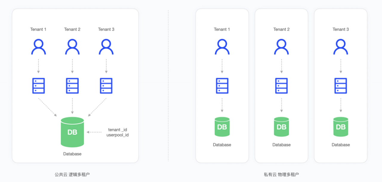 第三种方式是水平拆分。比如我们将 Users 这个数据库内的表进一步拆分为 Users1,Users2,Users3 等等多个表。要完成这个拆分我们需要考虑,面对多个表我们在查询时要如何去做的问题。这时我们需要按照我们的具体业务来判断。比如查询用户,我们可以根据用户 ID,将 ID 拆分分片,然后使用哈希算法让他们统一在一定范围内。之后我们每次拿到 Users 就通过哈希来计算具体在哪一片并快速抵达相应位置。Auting 多租户的设计就用到了拆分的概念,如下图所示。