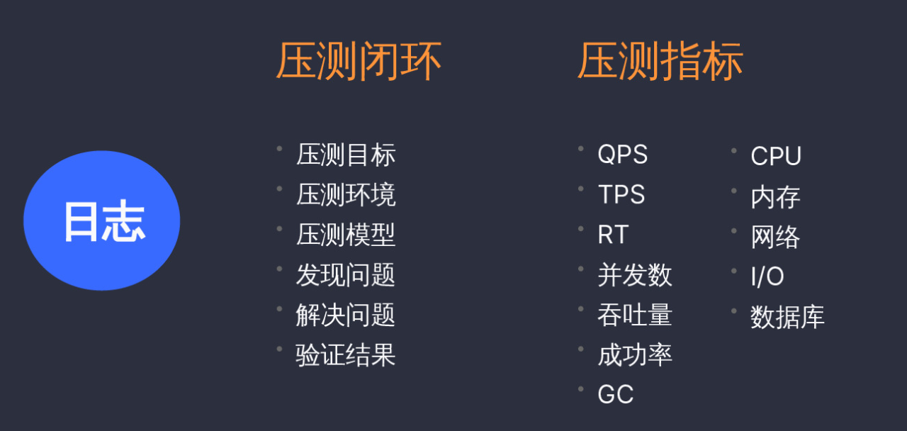 上图就是我们具体压测要关注的东西。首先我们要知道压测其实是一个闭环,因为我们可能会需要重复这个流程很多次,不断地重复发现问题、解决问题、验证是否生效、发现新问题这个过程,直到最终达到我们的压测目标。