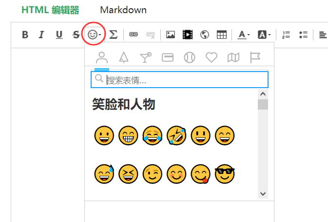 新增的 emoji 选择弹框提供了丰富的 emoji ,点击工具栏中的笑脸按钮「😊」即可进行选择。