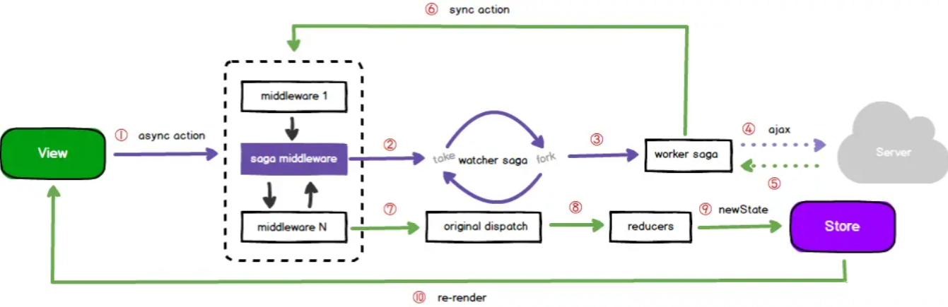 redux-saga 透传了 action 到 store,并且监听 action 执行相应的异步过程。异步过程的描述使用 generator 的形式,好处是可测试性。比如通过 take、takeEvery、takeLatest 来监听 action,然后执行 worker saga。worker saga 可以用 put、call、fork 等 effect 来描述不同的副作用,由 task 负责执行。