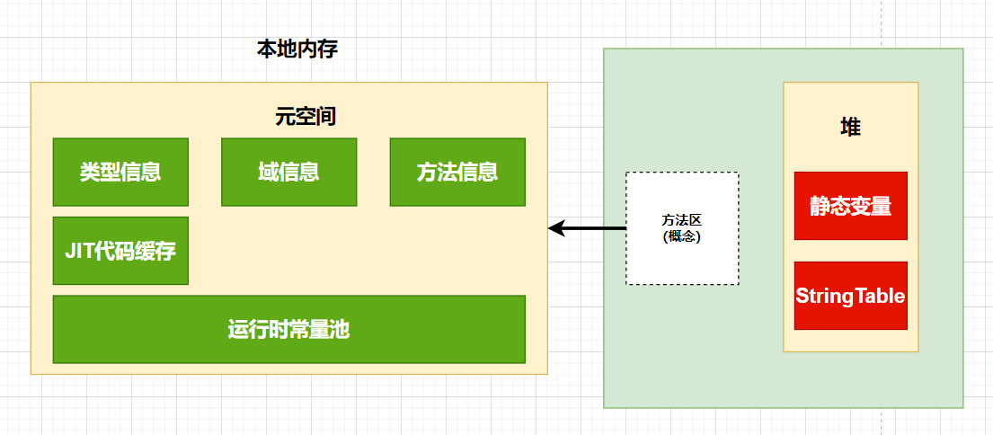 虽然 Java 虚拟机规范把方法区描述为堆的一个逻辑部分,但是它却有一个别名叫做 Non-Heap(非堆),目的应该是与 Java 堆区分开来。所以,方法区可以看作是一块独立于 Java 堆的内存空间。