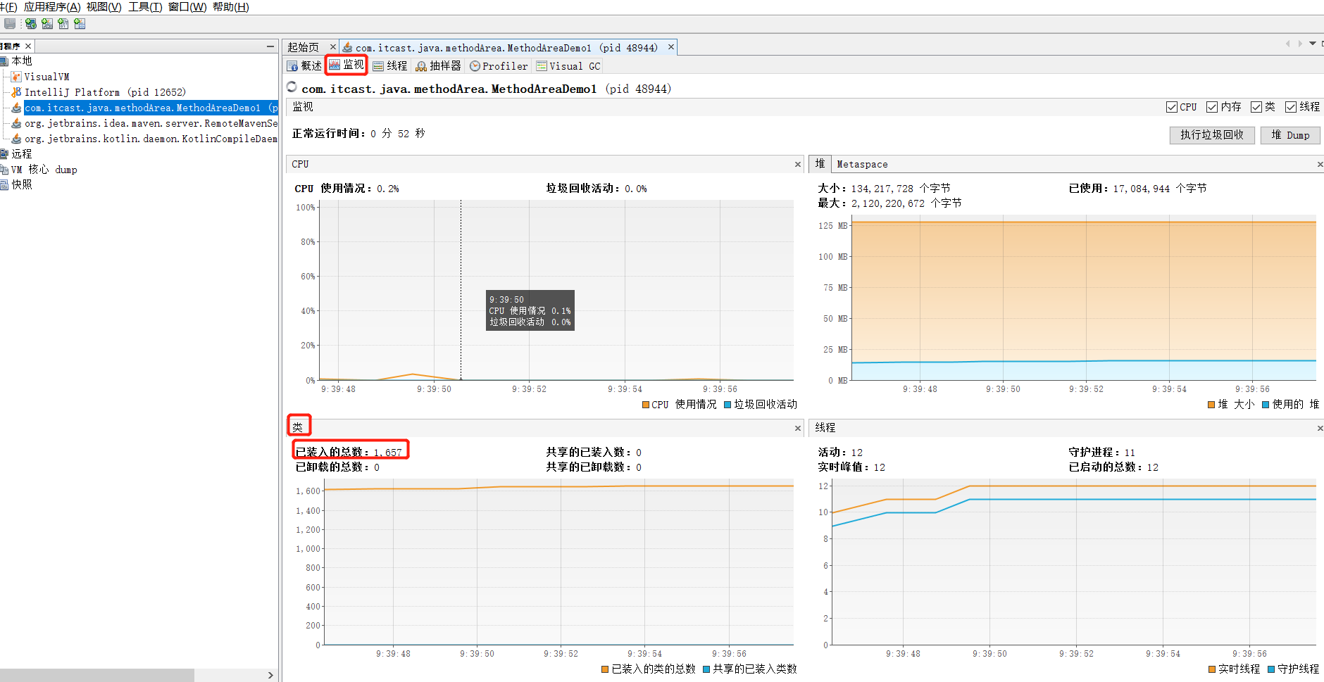 我们可以通过 JDK 自带的 jvisualvm 工具来查看程序加载的类文件: