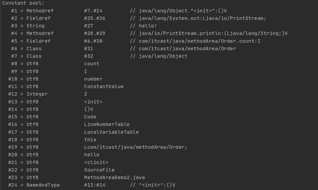 一个有效的字节码文件中除了包含类的版本信息、字段、方法以及接口等描述信息外,还包含一项信息那就是常量池表(Constant Pool Table),里边存储着数量值、字符串值、类引用、字段引用和方法引用。