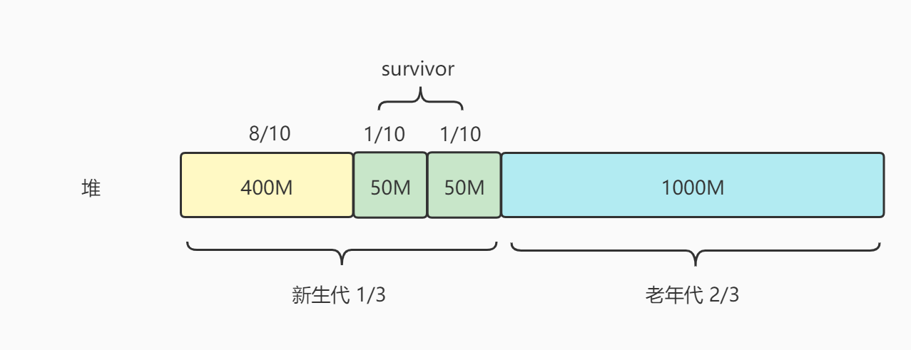 假设我们只有一台2核4G的服务器,分配给堆的内存一般就1.5G左右,通过计算,可以算出堆中每个区域的大小,如下图: