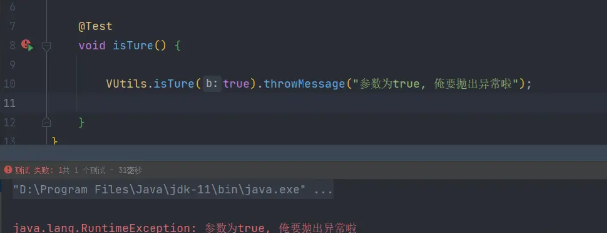 创建工具类VUtils并创建一个isTure方法,方法的返回值为刚才定义的函数式接口-ThrowExceptionFunction。ThrowExceptionFunction的接口实现逻辑为当参数b为true时抛出异常