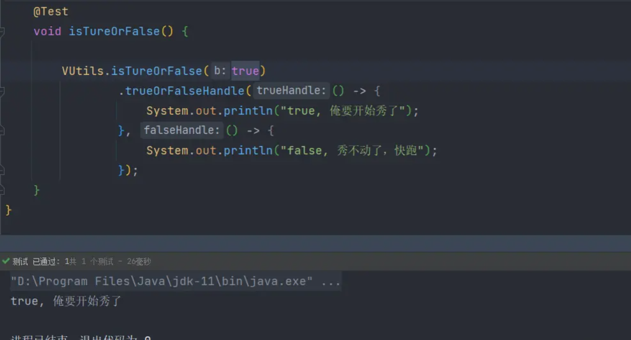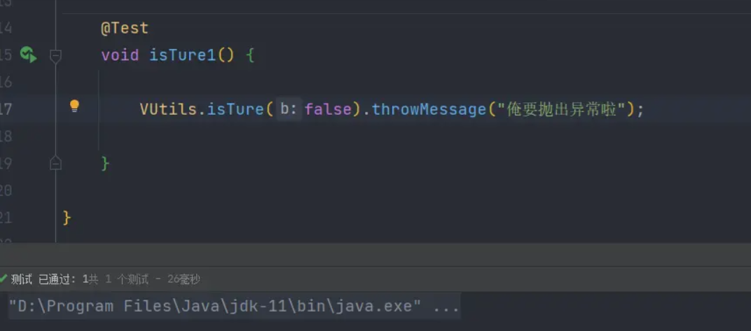 调用工具类参数参数后,调用函数式接口的throwMessage方法传入异常信息。 当出入的参数为false时正常执行