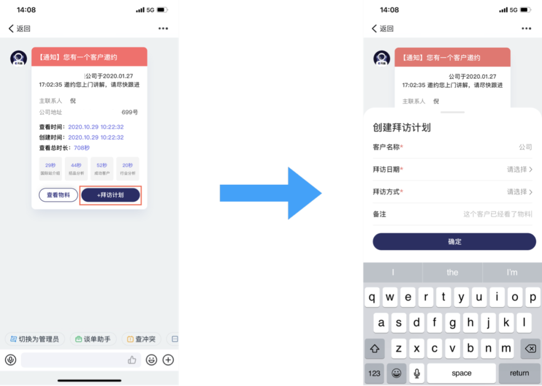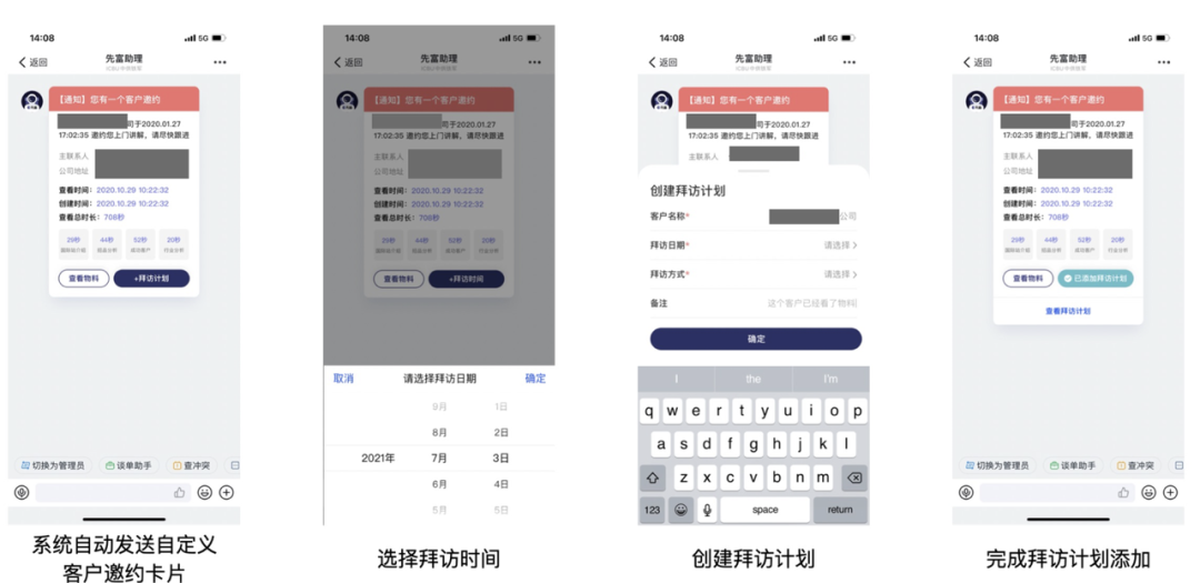 系统会通过机器人自动发送客户邀约,销售人员直接在卡片上操作,选择拜访日期,填写拜访计划表单,提交后邀约状态的表更也会直接展示在卡片内容上。