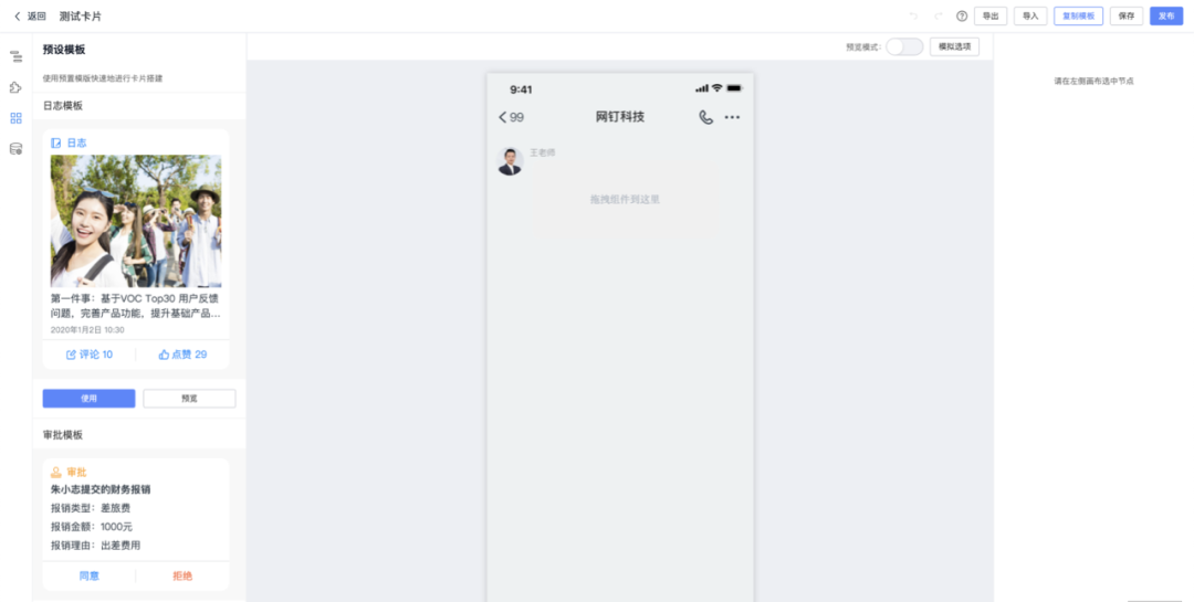 在搭建平台上,钉钉结合自身的小程序卡片实践,目前已沉淀了一系列通用模板供开发者直接使用,旨在帮助开发者以尽可能低的成本开发、使用小程序卡片。