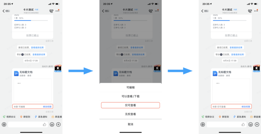 下图所示为钉钉文档卡片权限修改流程,用户可直接在卡片上修改对应文档权限:
