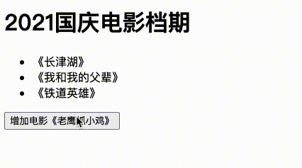 如何使用监听页面上元素的事件?使用方法 addEventListener(),下面示例通过点击按钮,在列表中增加新的电影排期,如下: