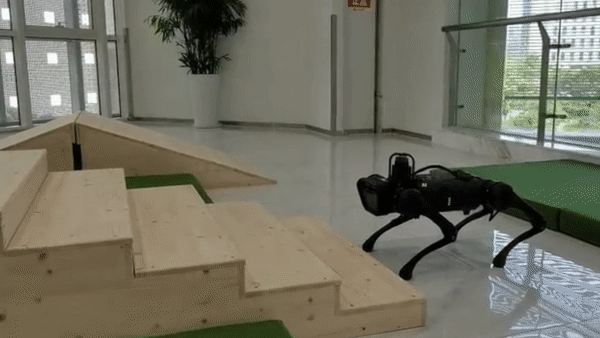我们可以看到,图中四足机器人无论是走独木桥,还是上下楼梯,都走的十分稳健。特别是在独木板场景,机器人学会了先把双腿步距缩小,以小碎步的方式平稳地穿过了独木板。这些步态都是基于强化学习自主学习得到,并没有通过任何的领域内专家知识进行引导。那么这些行走步态是如何训练出来的呢?
