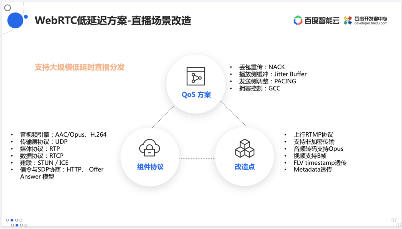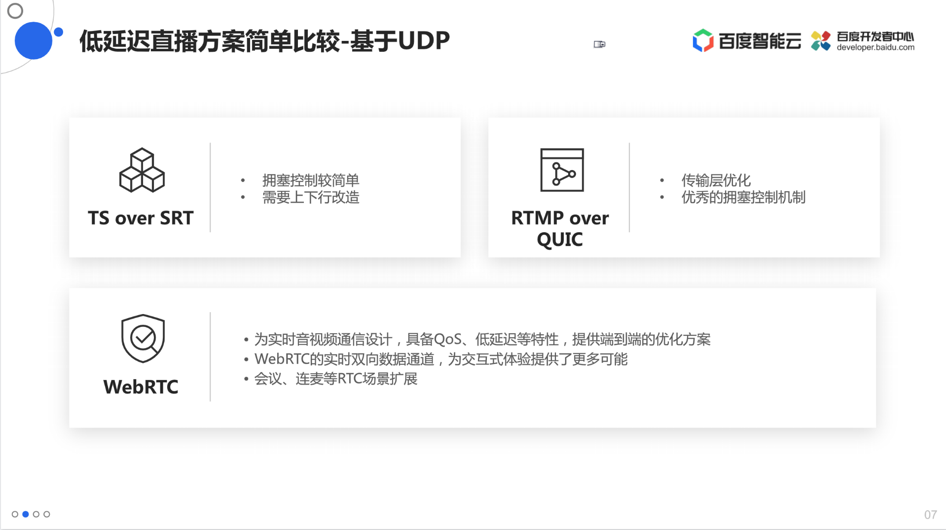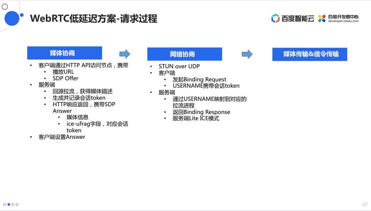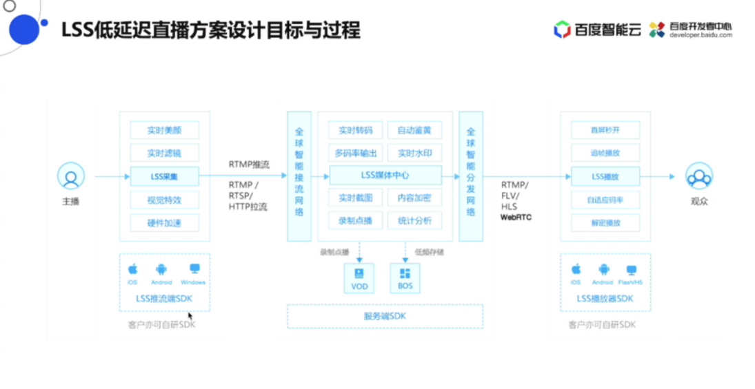 介于WebRTC生态繁荣,百度选择了WebRTC做为低延迟,在下一章节会基于百度智能云音视频直播服务LSS,详细介绍低延迟的直播方案实现。