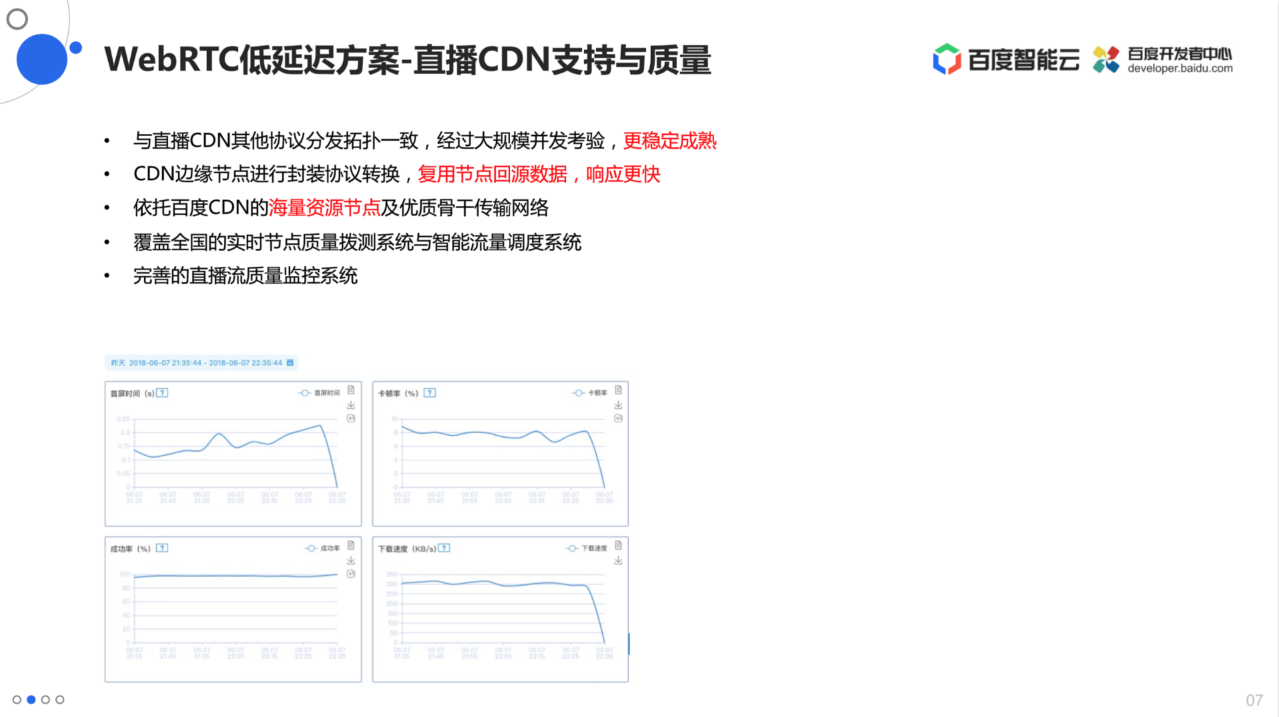 此外,百度 WebRTC 低延迟方案依托于百度 CDN 的海量资源节点以及优质骨干传输网络,建立了覆盖全国的实时节点质量拨测系统与智能流量调度系统,实现了更完善的直播流质量监控系统,可以实时监控直播流回源过程中的卡顿等指标。
